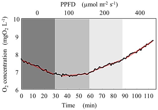 A representative change in the dissolved oxygen concentration over time under different PPFD levels is shown in Figure 7. The dissolved oxygen concentration was reduced to approximately 4 mgO2 L−1 for 30 min by the respiration of the clam in the dark. After the PPFD was set to 400 μmol m−2 s−1, the dissolved oxygen concentration increased to approximately 9 mgO2 L−1 by oxygen exchange in the clam.