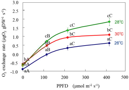 Gross photosynthetic rates were converted from values based on the anatomically measured mantle tissue area to values based on the apparent mantle area (Figure 11). The oxygen exchange rates in Figure 11, which reflect the actual photosynthetic capacity of the mantle based on directly illuminated area, increased compared with the values at 28 °C in Figure 9, especially at higher PPFD levels. The light saturation point based on the apparent mantle area was relatively further beyond the PPFD of 400 μmol m−2 s−1 (Figure 11) compared with that per anatomically measured mantle tissue area.
