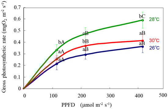 Effects of PPFD and water temperature on gross photosynthetic rates based on the apparent mantle area of Tridacna crocea clams. The water temperature was 28 °C, the water flow velocity was 30 mm s−1, the dissolved oxygen concentration ranged from 6.5 to 7.5 mg L−1, the pH was 8.0, and the salinity ranged from 3.0 to 3.5%. The vertical bars indicate standard errors (n = 4). Different letters indicate significant differences (p = 0.05).