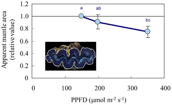 The gross photosynthetic rates per anatomically measured mantle tissue area of the zooxanthellae at 28 °C were approximately 1.7 and 1.4 times greater than those at 26 °C and 30 °C, respectively (Figure 9). The light saturation point at which the gross photosynthetic rate per mantle area reached a plateau was a PPFD of 400 μmol m−2 s−1 or higher (Figure 9). The apparent mantle areas of the T. crocea clam decreased with increasing PPFD (Figure 10). The value at a PPFD of 400 μmol m−2 s−1 was 0.75 times lower than that at 150 μmol m−2 s−1.