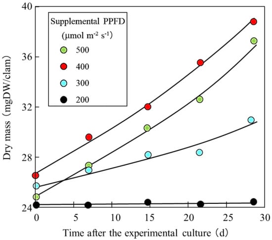 The light intensity was adjusted depending on the distance from the lamp. The PPFDs under supplemental light were 500, 400, 300, and 200 μmol m−2 s−1 without natural light. The water temperature was 28 °C, the salinity was 3.0–3.5%, and the duration of supplemental light was 12 h. The shell length, width, and height were measured every week to estimate the dry mass.