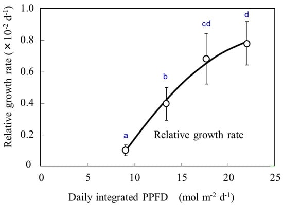 Effects of daily integrated PPFD on the relative growth rates of Tridacna crocea clams. The water temperature was 28 °C, the water flow velocity was 30 mm s−1, the dissolved oxygen concentration ranged from 6.5 to 7.5 mg L−1, and the salinity ranged from 3.0 to 3.5%. The vertical bars indicate standard errors (n = 3). Different letters indicate significant differences (p = 0.05).