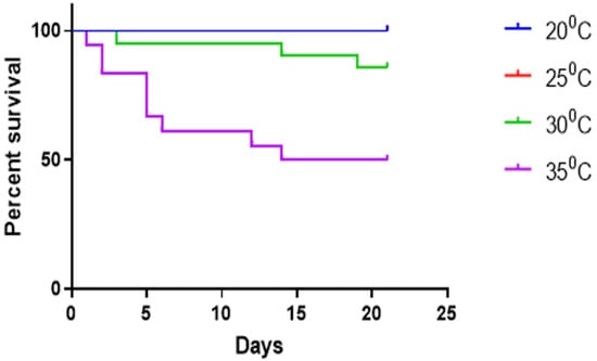 At the control temperature of 20 °C and the 25 °C test point, all individuals survived the duration of the experiment. However, mortality rates increased significantly at higher temperatures, with 14% of individuals succumbing at 30 °C and 43% at 35 °C (Figure 1). The Log-rank (Mantel–Cox) test shows the 30 °C and 35 °C curves are significantly different (p value < 0.0001).
