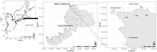 The sea urchin H. puclcherrimus has been harvested in the coastal areas of Fukui Prefecture since at least 1601 [7]. The target size of the sea urchin exceeds 2 cm in test diameter, and the fishing season is from 21 July to 20 August, according to Fukui Prefecture Fisheries Adjustment Regulations [8]. The test diameter of the sea urchin reaches 24–25 mm at the age of 2 years [9], and the spawning season is from December to April [10]. Brown and red algae have been identified in the gut contents of sea urchins, and macroalgae are their primary food source [11]. However, the catch of sea urchins has been declining. Additionally, the number of female divers (“ama”) engaged in sea urchin fishing has declined, but the relationship between both declines has not yet been verified.