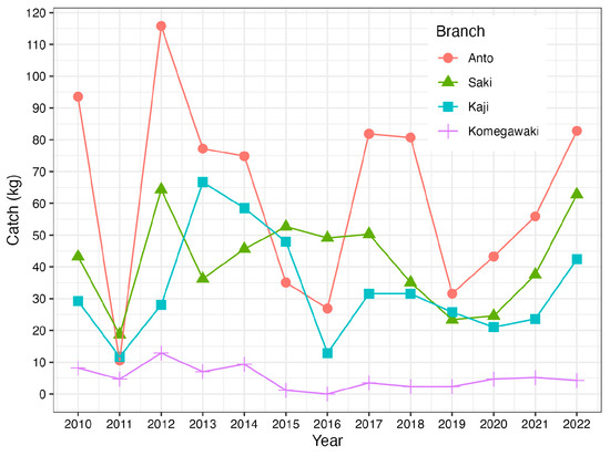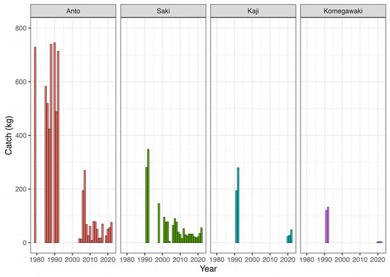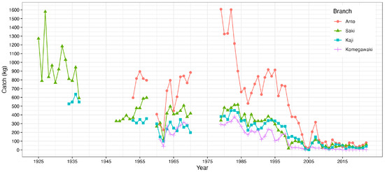 Catch data were obtained fragmentally from 1925 to 1970 and annually after 1979 (Figure 2). The catch fluctuated and declined over time, with considerable fluctuations in catch in Saki between 1925 and 1937, Anto between 1960 and 1970, and Anto between 1979 and 1995.