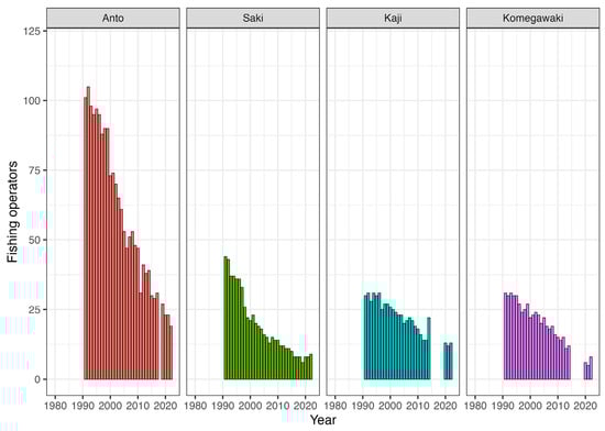 The total number of fishing operators declined with annual fluctuations. Only fragmentary data were available for Kaji and Komegawaki (Figure 7).