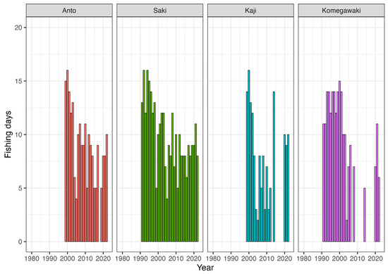 Fishermen voluntarily control their fishing efforts at the branch level of the Oshima Fisheries Cooperative [6]. Interviews with sea urchin fishermen confirmed that this system has been in operation since before 2020. The annual variation in the number of fishing days indicated that they were adjusted at the branch level for each fishing season (year) according to the natural stock abundance of sea urchins.