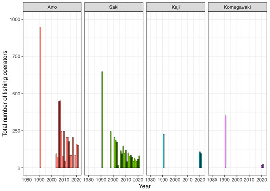 The total number of fishing operators decreased after 1991 (Figure 7). Logbooks collected from all fishing operators who fished for sea urchins at the study sites from 2020 to 2022 were examined, and a significant correlation was observed between the catch and the total number of fishing operators in each fishing ground [6]. In this study, the catch and the total number of fishing operators were tabulated annually, and a significantly strong positive correlation was observed for Anto and Saki (p < 0.05; Figure 9, Table 1). This indicates that a decline in the total number of fishing operators caused a decrease in catch.