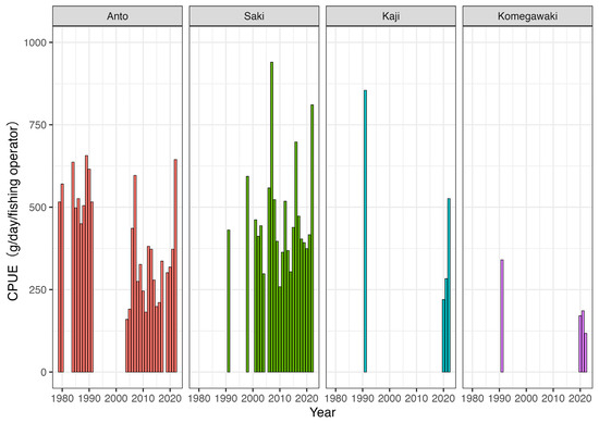 The annual catch, number of fishing operators, fishing days, total number of fishing operators, and CPUE are shown in Figure 4, Figure 5, Figure 6, Figure 7 and Figure 8. Empty years indicate when no data were available. Some catch data from 1980 to 1990 differ between Figure 2 and Figure 4. Although all catch data are derived from the fisheries cooperative, the reason for the differences is unclear.