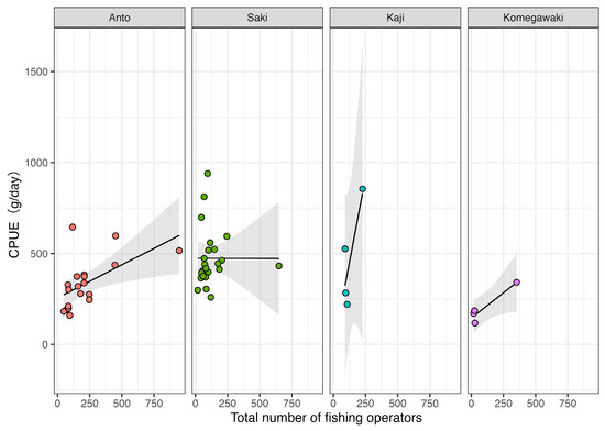 The relationship between the CPUE and the total number of fishing operators is shown in Figure 10. The linear regression formula, coefficient of determination, correlation coefficient, and p-values calculated from these relationships are listed in Table 2. The correlation coefficient was 0.617 for Anto, indicating a significant correlation (p < 0.05, Spearman’s rank correlation test). The correlation coefficients were 0.284 for Saki, 0.200 for Kaji, and 0.400 for Komegawaki, indicating no significant correlation (p > 0.05, Spearman’s rank correlation test).