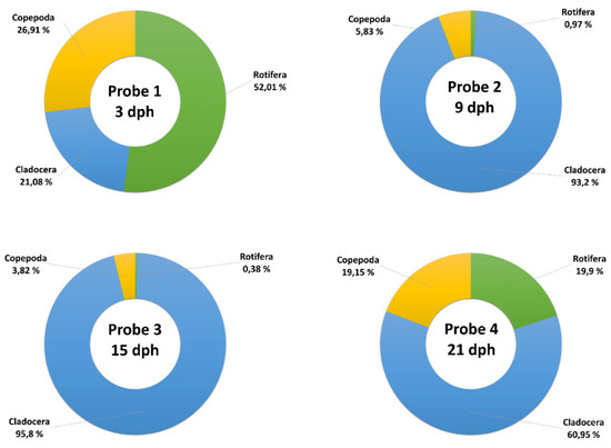 The taxonomic diversity of the zooplankton sampled from Sukhodolskoye Lake and sieved during the experiment is shown in Figure 2. Rotifers (approximately 52%) dominated in probe 1, followed by copepods and cladocerans—approximately 27% and 21%, respectively. In probes 2 and 3, cladocerans accounted for more than 93% of the taxon diversity, with rotifers accounting for less than 1% and copepods 4–6%. In probe 4, the cladoceran proportion was approximately 61%, with the rotifer proportion at approximately 20% and the copepod proportion at approximately 19%. Figure 3 illustrates the change in larval size during the experiment at 3, 9, 15and 21 days post-hatching.