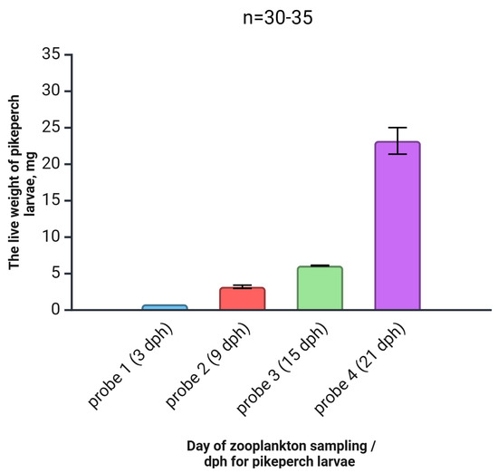 The larvae were reared at an initial density of 25 specimens per liter (around 2000 larvae per tank) in accordance with previous recommendations [28]. The plankton density in the fish tank was maintained at a level of at least 1000 individuals per liter, which is sufficient to support a high growth rate for perch larvae [40]. To determine the average weight of individual larvae, a sample of 200–250 larvae was taken at the beginning of the experiment. Three samples were collected, and the average weight was calculated. The larvae were sacrificed with clove oil, dried on filter paper, and weighed on a scale with a resolution of 1 mg. The number of larvae in each sample was also counted. During the study, body weight was determined in a smaller number of specimens (30–35). The survival rate of the larvae raised on zooplankton ranged from 3.6% to 4.4%, averaging 3.8 ± 0.22%. Immediately after capture from the lake, they were fed zooplankton in equal portions four times a day, from 8:00 a.m. to 8:00 p.m., every 4 h. The photoperiod (up to 100 lux) and water temperature remained at natural levels throughout the experiment. The water temperature ranged from 16 to 21 °C. These experiments were carried out in three replications for statistical significance.