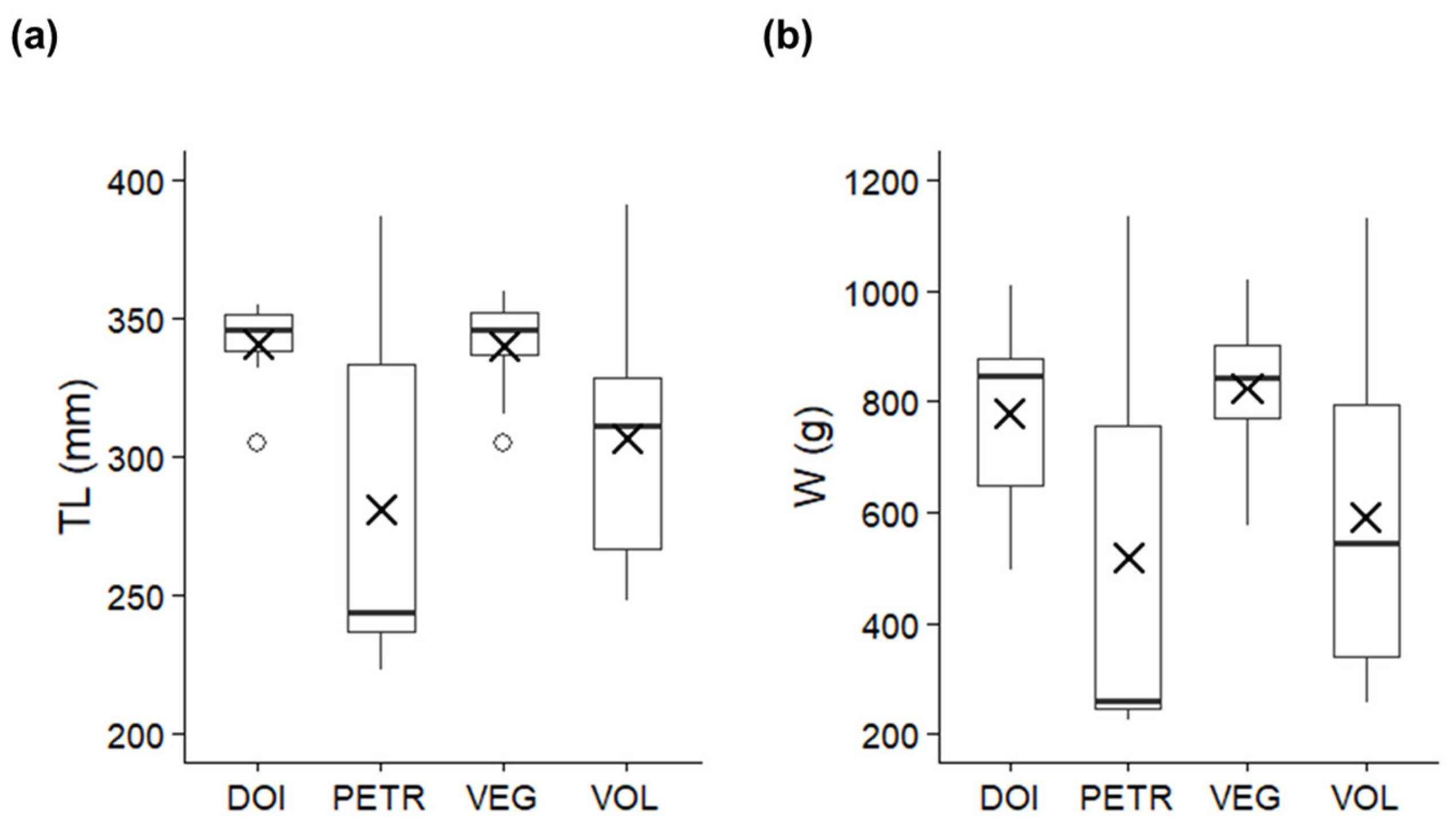 - Zhelev, Z.; Boyadzhiev, P.; Angelov, M. Analysis of size-age, sexual structure and condition of populations of Carassius gibelio (Pisces: Cyprinidae) from two water basins in Galabovo region (southern Bulgaria). Trakia J. Sci. 2015, 2, 185–195. [Google Scholar] [CrossRef]