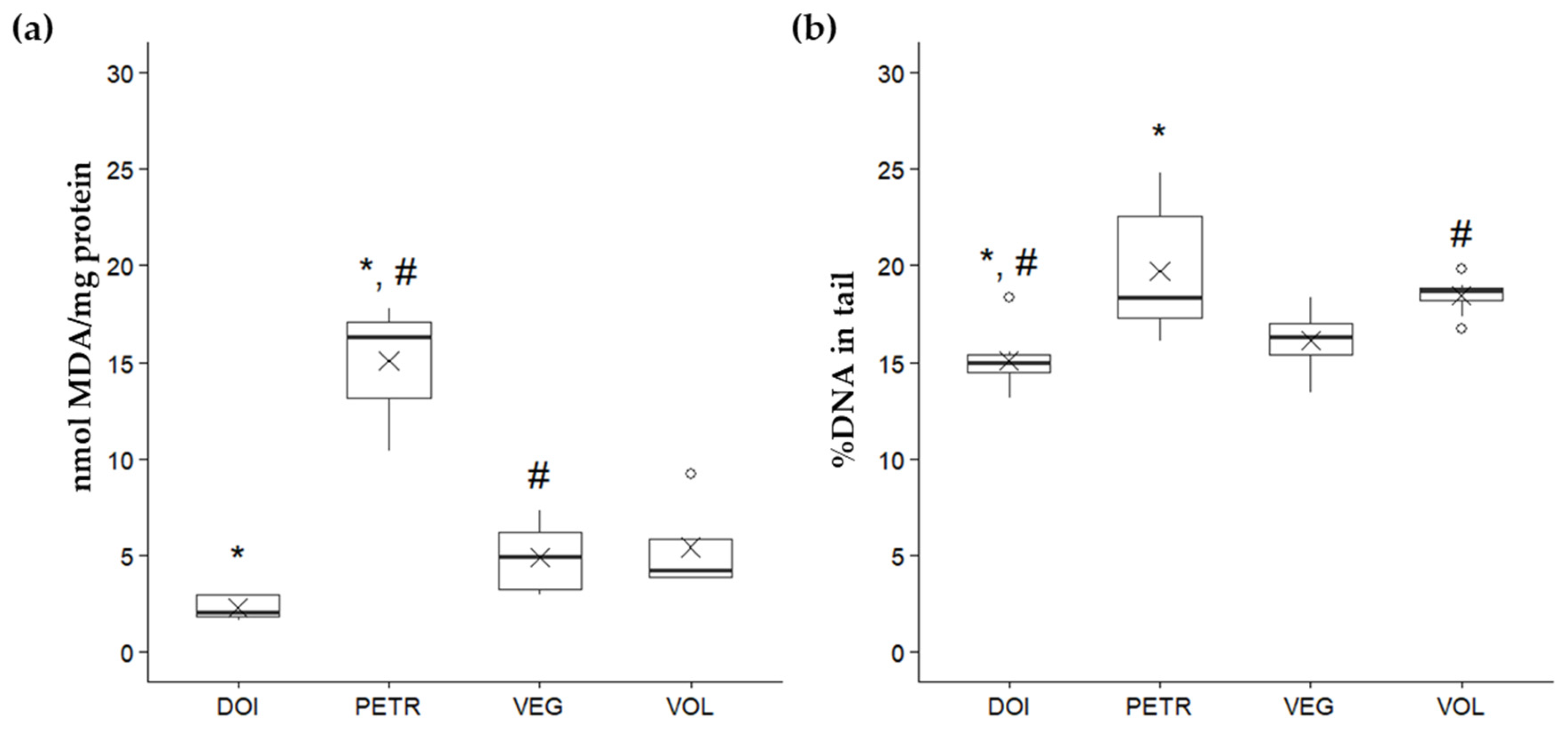 2.3.2. Alkaline Single-Cell Gel Electrophoresis (Comet Assay)