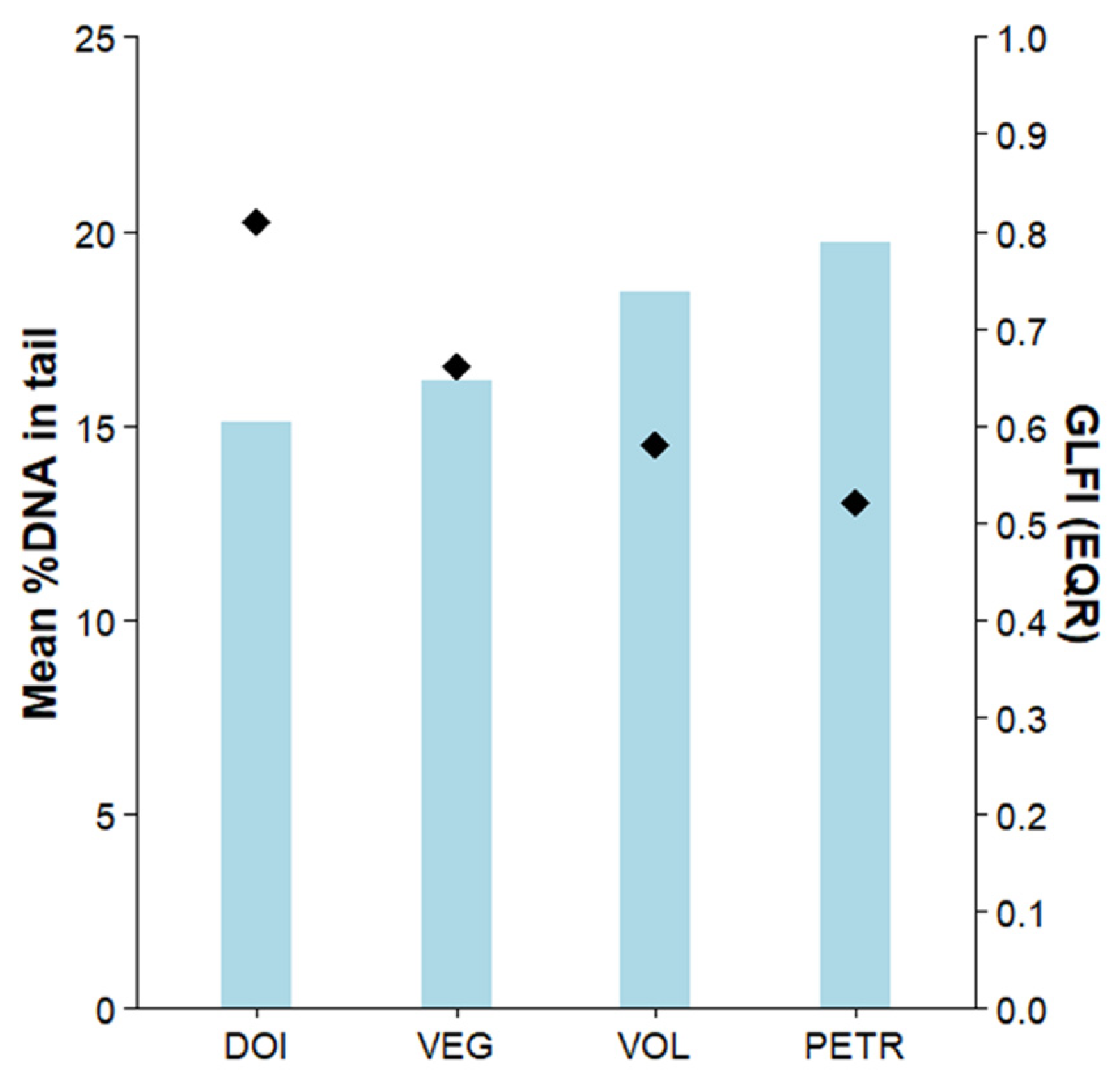 | Area | Mean Depth | Secchi Depth | pH | DO | EC | TP | NO3 | BOD | TSS | Chla | Mean MDA | Mean %DNA in Tail | |
