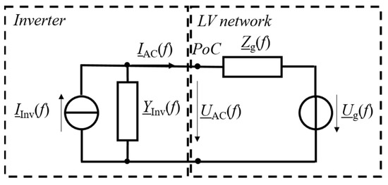 The third approach is the black-box approach. This approach is applied if no specific knowledge about the device is available. In this case, it is not possible to calculate the parameters of the black-box model from a white-box model. Consequently, the model has to be identified by measurements. The most common black-box model is the admittance-based Norton model. A further separation can be made into the decoupled Norton model (see Figure 1) that consists of a frequency-dependent current source of the device, i.e., the inverter, with IInv and a frequency-dependent admittance, e.g., YInv, and the more advanced, coupled Norton model, where the latter also includes the frequency couplings between voltage and current by an additional current. This linearized representation usually holds for small signal analyses of low-power single-phase inverters in grid-feeding mode. Grid-feeding inverters require a grid-side voltage uAC at their PoC to operate and will respond to this voltage in terms of a current iAC that is injected into the LV network. The coupled and uncoupled Norton models are typically used for harmonic power flow studies, although these studies are performed in the frequency domain assuming a steady state. However, simulations using these models can run into convergence issues if the boundary conditions of the solver are not fulfilled, such as for instable inverter operations. To the authors’ knowledge, no publications exist about these effects, but they occur regularly and are a current research focus. So far, it has been a challenge to distinguish between inappropriate solver settings and the insolvability of the harmonic power flow equations.