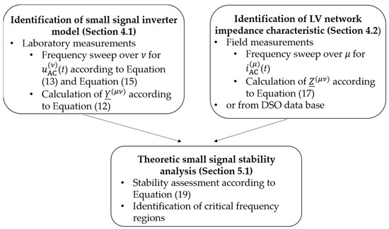 are in the right half plane (RHP). According to state of the art, the grid-side impedance is represented as an LTI characteristic; consequently, no interaction exists between the frequency coupling elements of the inverter, i.e., all components with |n according to Equation (19) and the LV network. A stable operation regarding the frequency coupling of the inverter is determined in advance by the measurements when identifying the FCM during the frequency sweep. If the impedance characteristic of the LV network also contains frequency coupling components, e.g., if a dominant penetration of devices with strong frequency coupling is present (e.g., six pulse rectifiers), the analysis can be performed by sweeping over n and considering a reasonable order of truncation M that will reflect the bandwidth of the frequency coupling components. Otherwise, the interaction with regard to the network-specific LTI characteristic can be analyzed by LTI analysis. As a summary, Figure 3 shows a scheme of the entire black-box method from the identification to the stability analysis.