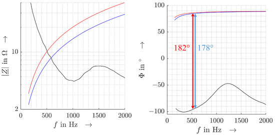 Impedance magnitude (left) and phase angle characteristic (right) of commercially available PV inverter (black): network impedance of test case 2 (blue) and test case 3 (red).