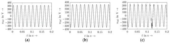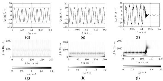 In Figure 6, the results of the voltage at the PoC (a–c), the current injected by the inverter in time domain (d–f), and the injected current in time-frequency domain (wavelet domain) (g–i) are presented for the three test cases. For the wavelet transform , a Morse wavelet with symmetry was applied for the normalizing constant with being the time–bandwidth product in terms of
