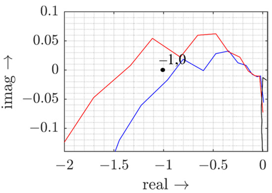 While the background voltage is purely sinusoidal, the inverter causes voltages at further frequencies at the PoC due to the injected current and its interactions with the network impedance in test cases 2 and 3. Since a stable system is defined as being able to reach steady state after being excited, test case 2 can still be considered as stable, even if the current and voltage show a slight but constant distortion. The system provides enough damping. Increasing the inductance reduces the phase margin and consequently the stability margin. In test case 3, the system cannot provide enough damping anymore, which leads to a much higher distortion component in the current (Figure 6f) and finally causes the inverter to trip. The inverter becomes instable. The respective Nyquist plot is depicted in Figure 7. The anticlockwise encirclement of the point (−1, 0) indicates the unstable characteristic (red curve).
