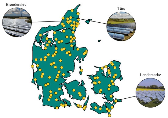 As of 2020, there were 262 large-scale solar district heating systems globally, corresponding to an installed capacity of 1.4 GW [3]. Currently, Denmark leads the market in both number of systems and total installed capacity, with 124 systems in operation. The locations of the active solar heating plants in Denmark are shown with yellow dots in Figure 1 (see http://solarheatdata.eu (accessed on 6 March 2022) for detailed information). All of the plants in Figure 1 are based on flat-plate solar collectors, except for the three highlighted plants. Instead, these three plants utilize concentrating solar collectors (Brønderslev and Lendemarke) or a combination of concentrating and flat-plate collectors (Tårs).