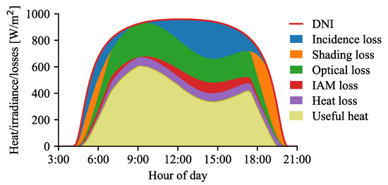 The impact of the coefficients listed in Table 1, as well as the influence of shading and incidence losses, are illustrated in Figure 5. The figure shows the DNI for a clear-sky day, the magnitude of the various losses, and the useful heat generation. The incidence loss represents the reduction in irradiance caused by the collector surface not being oriented normal to the sun. Due to the tracking axis orientation, the incidence loss is relatively low during the morning; however, in the afternoon, the sun azimuth aligns with the tracking axis resulting in large incidence angles. This gives rise to the bimodal production profile (useful heat). The largest loss is the optical loss, which corresponds to the peak efficiency parameter () in Table 1 (also sometimes called the optical efficiency). The heat losses from the collector field are also visualized in Figure 5, which are relatively small compared to the other losses.