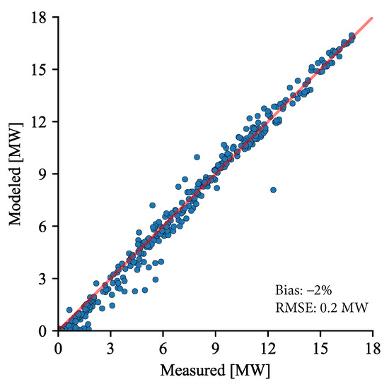 Lastly, the measured and modeled hourly heat generation for the entire validation period are shown in Figure 7. The scatter plot shows minor variations, but generally, there is good agreement between the simulated and measured heat generation. Based on the hourly values shown in Figure 7, the root-mean-square error (RMSE) was 0.2 MW and R = 99%. Overall, there is a slight negative bias (−2%) of the simulation model results. This implies that the model has a tendency to underestimate the heat output.