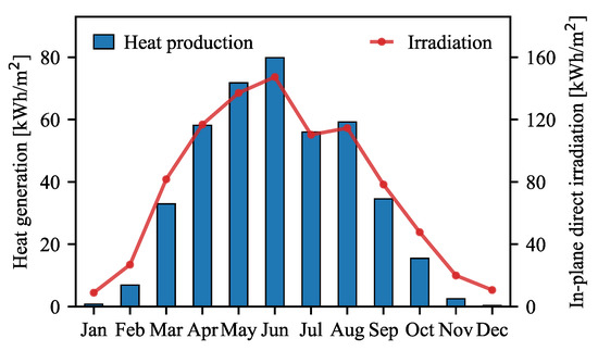 Monthly heat generation and in-plane direct irradiation.