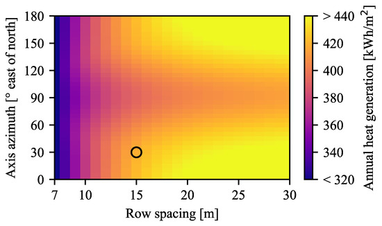 To aid in this decision making, the annual performance as a function of row spacing and axis azimuth orientation is shown as a heat map in Figure 9. Apart from changes to the two parameters, the investigated systems have the same specifications as the solar field in Brønderslev, previously described in Section 3.2. As expected, Figure 9 shows a clear trend of increasing heat generation with increasing row spacing. The reduction in heat generation due to shading is especially pronounced for row spacings shorter than 13 m. In comparison, the variation in heat generation due to the axis azimuth for a fixed row spacing is much less pronounced. The figure also clearly shows that a north–south axis orientation (0° or 180°) is optimal, and an east–west axis orientation (90°) is the least favorable.