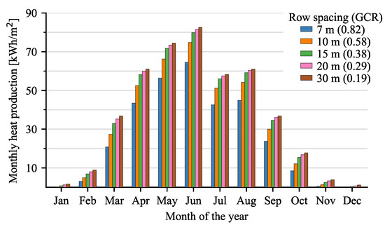 To investigate the impact of row spacing in more detail, the monthly heat production for five different collector distances is shown in Figure 10. The figure shows a heat gain of 6% when doubling the row spacing from 15 to 30 m. In comparison, there is a much larger gain (36%) when the row spacing is increased from 7 to 15 m. This demonstrates that already with a row spacing of 15 m (GCR = 0.38), the effect of shading is relatively low, and there is only a minor gain to be had by increasing the row spacing above 15 m. The economical optimum row spacing is, therefore, expected to be in the range of 11 to 16 m, depending on land costs.