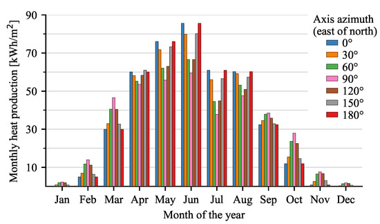 Furthermore, Figure 11 shows the monthly heat production for different axis azimuth orientations. This figure validates the finding of other authors; that the maximum annual energy output in Denmark occurs for a north–south orientation (0° or 180°). However, while this is valid on an annual basis, this is not the case for each month. For example, from September to March, an east–west tracking axis (90°) is preferred due to the lower solar elevation during this time of year. Thus, as the heat demand is higher in winter, it may be preferred to choose an orientation that better matches the demand profile and not the orientation that results in the highest energy yield.