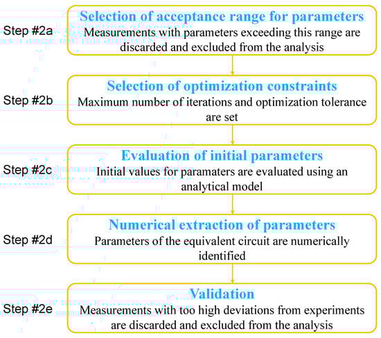 Finally, their values are validated. First, it is verified that the obtained parameters are included in the acceptance ranges of step #2a. Then, the I-V curve is traced according to previous equation using the obtained parameters, and the power deviation ∆P at the maximum power point is evaluated. Curves with ∆P > 1% are excluded from the analysis. The flowchart of step #2 is reported in Figure 2.