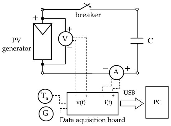 In this work, the first method is used: the PV generator feeds a capacitive load that is initially discharged. In the circuit, a power breaker permits control of the opening and closing of the circuit. When the breaker closes the circuit, the load is fulfilled by the PV generator from short-circuit to open-circuit conditions. A common issue with this method is that current peaks may occur at the beginning of the charging transient, i.e., immediately after the circuit is closed. A common practice is to exclude this first part of the acquired signals from subsequent analyses. However, this operation leads to a loss of information close to the short-circuit point. To solve this issue, a negative pre-charge may be applied to the capacitive load: this procedure permits current peaks when voltage is still negative. As a consequence, the excluded region of the I-V curve is not of interest and the loss of information is avoided. The capacitance of the capacitive load must be properly selected as a function of the desired duration of the charging transient t. Indeed, according to [28], this quantity is a function of the short-circuit current Isc, the open-circuit voltage Voc, the number of parallel-connected PV strings Np, the number of PV modules in series per string Ns (each module consists of Nc series-connected cells), and the capacitance C of the capacitor in the following way: