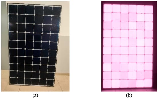 The procedure presented in this work is applied to an all-back contact monocrystalline PV module. The performance of the module was tested before applying the proposed technique: in particular, the I-V curve of the module was determined at standard test conditions (STC) and it was compared with the data provided by the manufacturer. Moreover, an electroluminescence (EL) test [30] was performed to check the presence of defects or mechanical cracks. In particular, the power deviation with respect to manufacturer data is in the uncertainty range of the measurement system, and the EL image in Figure 4 confirms the absence of defects and cracks. According to the manufacturer datasheet, the main electric parameters of the analyzed PV module are summarized in Table 3.