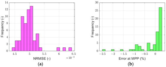 The numerical extraction was properly performed, obtaining most of NRMSEs < 6∙10−3 and most of the errors at the MPP are in the range −0.5% − +0.5%. The results of step #3 are presented in Figure 7.