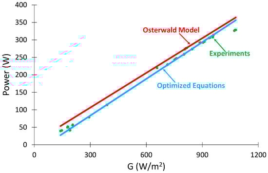 This step consists of using the optimized equations to evaluate, for each weather condition (irradiance and temperature) from the experimental campaign, the maximum PV power, and the generated energy in the campaign. For each measurement, the corresponding weather conditions are used to estimate the values of the parameters for the SDM according to the optimized equations from previous step. Then, the I-V curves are traced by solving Equation (3), and the maximum power is identified. This value is compared with the experimental data and with the corresponding quantity estimated by the most common model used in the literature, i.e., the Osterwald model (OM) [24]: