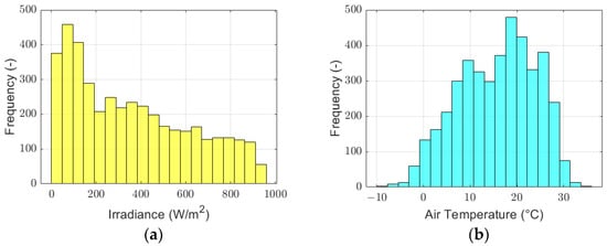 The effectiveness of the technique is validated by estimating the generated PV power in the measurement conditions. These values (blue curve in Figure 8) are compared with the experiments (green dots) and with the prediction by the OM (red curve). The technique performs better than Osterwald, providing a NRMSE in power prediction of 6.7%. The improvement with respect to the Osterwald error (9.1%) is ≈26%. The energy estimation is performed by assuming constant PV power in a time interval of 1 min. The proposed model underestimates the generated energy (∆Eopt = −0.19%), while the prediction by the OM is overestimated (∆EOst = +8.28%) with respect to the experiments. In a future work, this method will be applied to wider experimental datasets. Figure 9 presents the irradiance and air temperature distribution for a reference year in Turin (hourly updated, for a PV installation with azimuth = 0° and tilt angle = 30°) during sunlight hours.