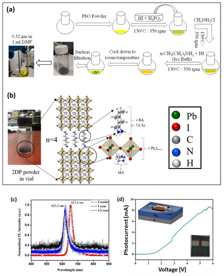 (a) Synthesis process of 2DP ((CH3(CH2)3NH3)2(CH3NH3)3Pb4I13) powder using the precursors shown. (b) Synthesized 2DP powder in a vial (left), and the concomitant crystalline structure for the n = 4 formulation (right). (c) The inherent stability of the 2DP powder was gauged using steady-state PL measurements, gathered over the course of 1.5 years, for crystals stored at ambient temperatures in a desiccator. A slight blue shift of 29 nm in the peak position with time was evident, but the crystals were still photoactive with a well-defined emission peak, and a FWHM that was largely unchanged over the 1.5 years of observation time. (d) The 2DP crystals were dispersed in solution and spin cast into thin films on an oxidized Si substrate with metal electrodes that were deposited using a shadow mask. Here the Ip was measured as a function of voltage and the top inset shows the schematic of the device, with the fabricated version of the device seen in the bottom inset.