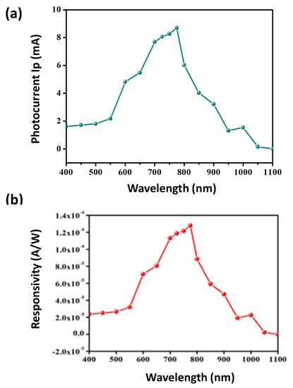 (a) The Ip was measured as a function of λ over the 400 to 1100 nm spectral range for the 2DP film photoabsorber where the peak in Ip occurring at ~775 nm was consistent with the peak position of the PL emission spectrum for our n = 4, 2DP formulation. (b) Responsivity R as a function of λ over the same spectral range, and again, the highest R coincided with the PL peak emission observed in our 2DP photoabsorber. The laser power used was ~200 µW and the laser spot size of the fiber optic cable irradiating our device defined an active area of ~5 µm2.
