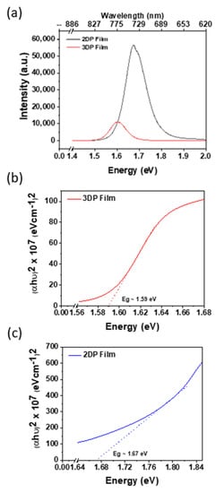 After our electronic transport measurements on the synthesized 2DP films, we then proceeded toward their integration in the PSC fabrication process, and alongside we also prepared our 3DP (MAPBI3) films for comparative analysis. Both films were formed on top of FTO substrates and their optical properties were studied using PL spectroscopy which was measured using the LabRAM HR Evolution spectrometer (HORIBA Scientific) equipped with a 532 nm excitation laser. Figure 3a shows the PL spectra comparatively for the spin-coated 3DP and 2DP films, where a blue shift in the emission peak for the 2DP film (~739.4 nm) is present, in comparison to the 3DP film (~773.4 nm) which corresponds to ~1.67 eV and ~1.60 eV, respectively. We also characterized the 3DP and 2DP films using UV-Vis optical absorption spectroscopy, measured using the Agilent CARY 5000 spectrophotometer, and the data are shown in Figure 3b,c, respectively. From the absorbance data, the optical bandgap Eg was calculated using the Tauc plot, where (αhυ)2 was plotted as a function of the energy, hυ here υ is the frequency of the incoming light source and h is the Planck’s constant. Using the Tauc equation the x-intercept to this plot represents the optical Eg. Since organic-inorganic metal halide perovskites are direct bandgap semiconductors, the n was assumed to be 2, and α the absorption coefficient, was calculated using the absorption data according to . The thickness of the 3DP was ~400 nm and that of the 2DP film was ~360 nm, based on spinning parameters used. From the linear extrapolation of the plot, the Eg for the 3DP film was determined to be ~1.59 eV, as shown in Figure 3b, while the Eg for the 2DP film was determined to be ~1.67 eV, as shown in Figure 3c. These values are in close agreement with the PL emission peaks which were calculated to be ~1.60 eV and ~1.67 eV, respectively, from the data in Figure 3a.