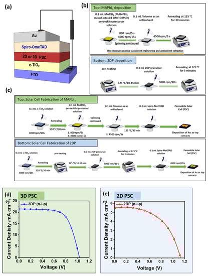 For extracting the PV device parameters, we fabricated PSCs using the 3DP and 2DP absorbers in the n-i-p architecture, as shown by the schematic in Figure 4a. The working principle in this regular architecture proceeds according to an incoming photon being absorbed within the 2D or 3D absorber layer, and leading to the generation of electron-hole pairs or bound excitons in the active layer. These excitons are then separated and collected in the respective electron transport layer (ETL) and HTL, and subsequently generate a current at the terminals. The deposition and spin coating conditions for the MAPbI3 and ((CH3(CH2)3NH3)2(CH3NH3)3Pb4I13) are summarized in Figure 4b-top and Figure 4b-bottom, respectively. For the 3DP film deposition process illustrated in Figure 4b-top, the one-step solvent exchange process was used with the Lewis-base-acid adduct in 4:1 anhydrous DMF:DMSO with precursors MAI (1.5 M) and PbI2 (1.5 M), while the solution was stirred overnight at RT. Figure 4b-top shows the spinning conditions with an initial 800 rpm for 5 s, followed by 4500 rpm at 20 s using 100 μL solution. For the antisolvent, 0.1 mL of toluene was slowly dripped on the rotating substrate in the last 5 s, which is important for the controlled reaction kinetics and nucleation of the film. The substrate was then transferred to a hotplate for annealing at 125 °C for 30 min. On the other hand, the 2DP ((CH3(CH2)3NH3)2(CH3NH3)3Pb4I13) film was deposited using the hot-casting technique on a pre-heated FTO substrate at ~125 °C, as shown by the film synthesis process flow in Figure 4b-bottom, where the 2DP precursor was deposited at 5000 rpm for 20 s and annealing was conducted at 125 °C for 3 min.
