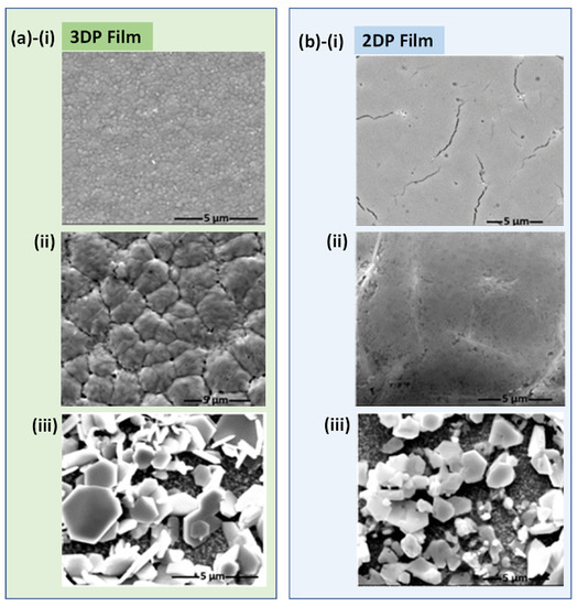 Surface morphology characterization studies conducted on spin coated 3DP and 2DP on top of FTO substrates for three cases, (i) freshly deposited films at t = 0, (ii) exposed to room temperature ambient (RT) for a duration of 8 h at 25 °C and 45 ± 5% RH (uncovered), and (iii) exposed to 90% RH in an inhouse simulated humidity chamber at ambient temperatures for 30 min. SEM images corresponding to 3DP films that are (a)-(i) freshly deposited, (ii) ambient RT exposed, and (iii) exposed to RH > 90%. While the freshly deposited films in (a)-(i) appear dense, the RT exposed films in (a)-(ii) reveal signs of void formation, particularly at boundaries separating the grains, while in (a)-(iii), the films have disintegrated, and the substrate is also discolored. SEM image corresponding to 2DP films that are (b)-(i) freshly deposited, (ii) ambient RT exposed, and (iii) exposed to RH > 90%. Unlike the case for the 3DP film, the 2DP film still appears smooth and dense in (ii) after it is freshly formed in (i), but the onset of degradation is evident when the 2DP films are exposed to 90% RH (iii). However, from the comparative analysis, it appears the 2DP films are denser and smoother and can sustain exposure to ambient conditions, well beyond that possible with the 3DP films.