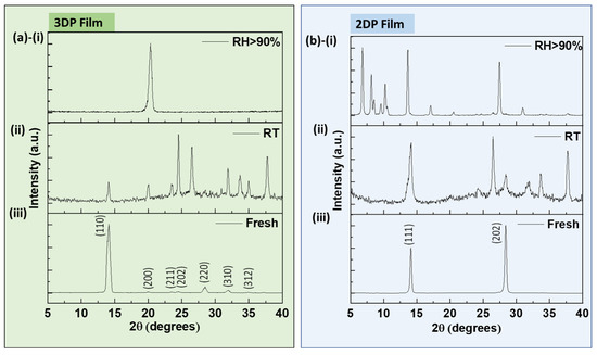 XRD analysis of (a) 3DP and (b) 2DP films. The films in (a)-(i) and (b)-(i) are exposed to 90% RH for 30 min., (a)-(ii) and (b)-(ii) exposed to RT for 8 h, and (a)-(iii) and (b)-(iii) at t = 0 for freshly deposited films; further details on the specific environmental conditions are provided in the caption of Figure 5. For the 3DP films, the amplitude of the (110) peak is diminished significantly even upon exposure to the RT conditions in (ii), while for the 2DP film the (111) peak is strongly active even after exposure to the conditions in (ii). From the (110) and the (111) peaks for the 3DP and 2DP films, respectively, the grain size S at t = 0 for freshly deposited films and RT exposed samples was computed using the Scherrer formula and the data are summarized in Table 2.