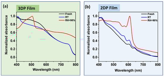 UV-vis optical absorption measurements on spin coated (a) 3DP and (b) 2DP films on top of FTO substrates at the three conditions noted in the caption of Figure 5. The onset of the optical absorption edge for the 3DP freshly synthesized film at t = 0 occurs at ~775 nm in (a), while this absorption edge starts at a shorter λ, less than 700 nm for the 2DP film in (b). For the RT exposed 3DP samples in (a), there is already a reduction in the absorbance below 625 nm, while for the RT exposed 2DP samples in (b), an improvement in the absorbance is seen for all wavelengths in the measurement range below the optical absorption edge, i.e., <700 nm. For the 3DP exposed to RH, there is once again a general reduction in the optical absorption based on the intensity, and a sharp rising edge occurs at λ < 525 nm which maybe attributable to the breakdown of the 3DP film into PbI2 which is optically active at shorter λ, closer to the near-UV region. Equivalently, for the 2DP film, several optical resonances surface between 550–650 nm at all of the three environmental conditions examined, which are not present in the spectra of the 3DP film. The optical resonances in the 2DP films may be attributable to quantum confinement and excitonic effects given the reduced physical dimension of the 2DP crystalline structure.