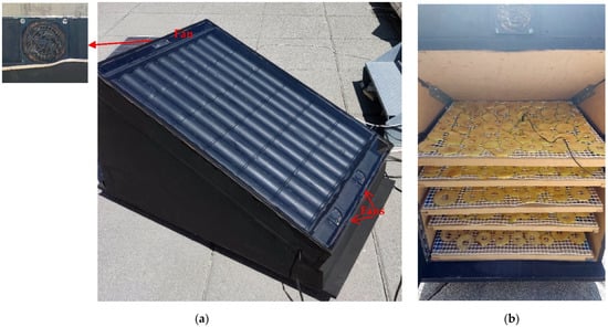 Prototype 1 consisted of a solar collector (57 × 86 cm2) assembled on the top of a drying chamber, with a tilt of 20°, as illustrated in Figure 1a. The solar collector had three fans of 12 V to force the flow of air through the aluminum cans, perforated and painted black, introducing the hot air into the dehydration chamber below. To reduce the convective losses, the collector top had a 4 mm window glass. The drying chamber had several plastic sliding trays with different mesh sizes that were adjustable to the kind of product we wanted to dry (Figure 1b). The base of the stand was equipped with swivel wheels to provide portability. One ventilation fan was located inside to distribute the hot air to the all-drying chamber, avoiding hot or cold spots. A 100 W photovoltaic panel provided energy to the fans and data acquisition system.