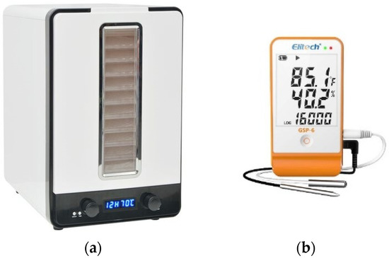 An electric commercial dryer, VidaXL Food Dehydrator with 10 trays, 550 W, adjustable temperature from 40–70 °C (Figure 3a), was used to compare results. We added two Elitech® GSP-6 temperature and humidity data loggers to monitor the bottom and top of the dryer (Figure 3b). Electricity consumption was measured using a Power Meter, Energenie ENER007.