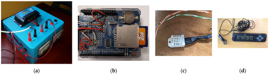 The 100 W photovoltaic panel was connected to a 12 V 65 Ah battery through a solar charge controller (Figure 4a). This system can feed up to six fans at the same time. The 5 V USB type output of this charge controller feeds an Arduino system (Figure 4b) that registers the inside and outside relative humidity (RH) and temperature from the sensors (Figure 4c). The inside and outside temperature were also measured with a thermometer with an LCD display.