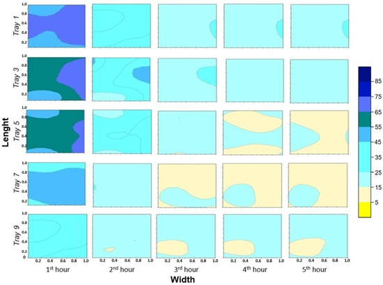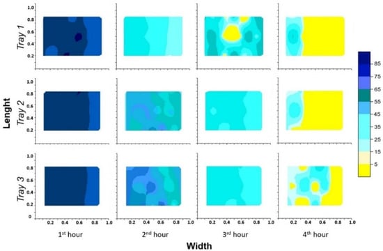 Drying dynamics inside the chamber of Prototype 2 (1–7 h): Tray 1—top, Tray 2—middle, Tray 3—bottom; the scale refers to percentage of weight remaining.