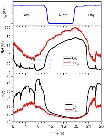 It is commonly discussed that one of the major problems concerning solar energy is the fluctuations during the day due to the clouds and through the day and night cycle. To assess this problem, we measured the solar irradiance, the temperature (inside and outside) and the air RH (inside and outside) using Prototype 2 and sliced apples. The results are displayed in Figure 7, where time zero represents the beginning of the experiment at 8:00 (GMT). On the day under consideration, the sky did not present any clouds. The RH of the air entering the drying chamber reached a minimum of 30% around 8–9 h (16:00–17:00 GMT). At almost the same time, the temperature inside the chamber reached its maximum of 67 °C. Some oscillations in the temperature that can be seen on the graphic during this period were due to the opening of the chamber to follow the ongoing drying test. The continuous decrease in the RH inside the chamber might be an indication that most of the moisture from the apples had already been removed. At lower moisture content, the water diffusion inside the slices becomes slower, so the drying kinetics also slows down. During the night, the temperature cools to 15 °C and the RH inside the chamber exceeds 75%, leading to the re-hydration of the apple slices.
