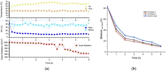 To compare the drying kinetics between the solar prototypes and the electric commercial dryer, we chose a sunny day in June to perform an experiment. We had sliced golden-smith apples to the same thickness and distributed them on trays in monolayers. Each tray was weighed at the beginning and at intervals of one hour. The obtained results, in terms of comparison between our prototypes and the electric commercial dryer, are shown in Figure 8. The maximum solar radiation registered was around 1002.6 W/m2, a value that includes a contribution from diffuse radiation. The temperature inside the chamber of the solar prototype was around 60 °C, with a maximum of 67.4 °C. The minimum RH was 9.2% (28.4 °C and 41.7% RH outside of the chamber). To compare results, we performed the drying in the electric dryer at 60 °C. We can see in Figure 8b that there were no significant differences in terms of moisture loss over time. At the end of the experiment, after 6 h, the moisture content of the apple slices was almost the same, at around 10%.